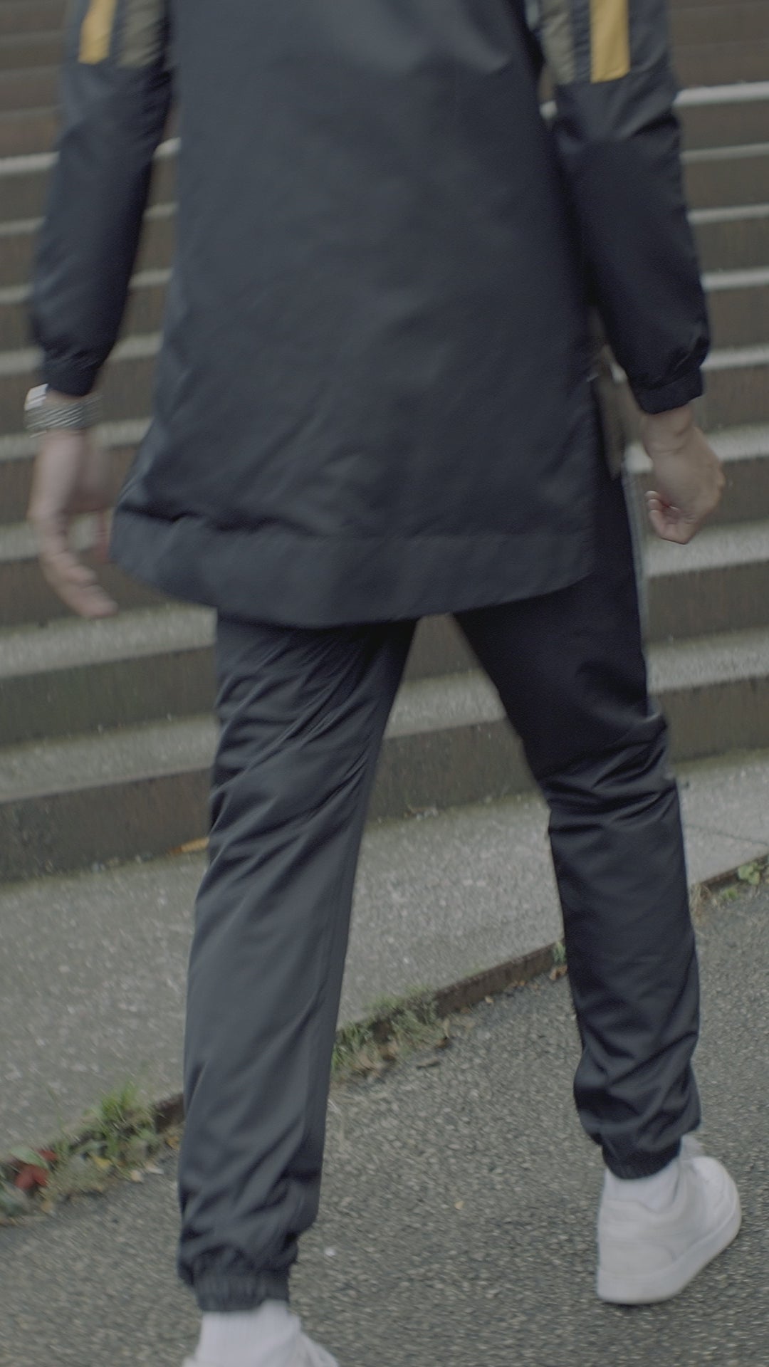 La veste longue apporte une allure distinctive, tandis que le pantalon resserré à la cheville assure un tombé net et confortable.